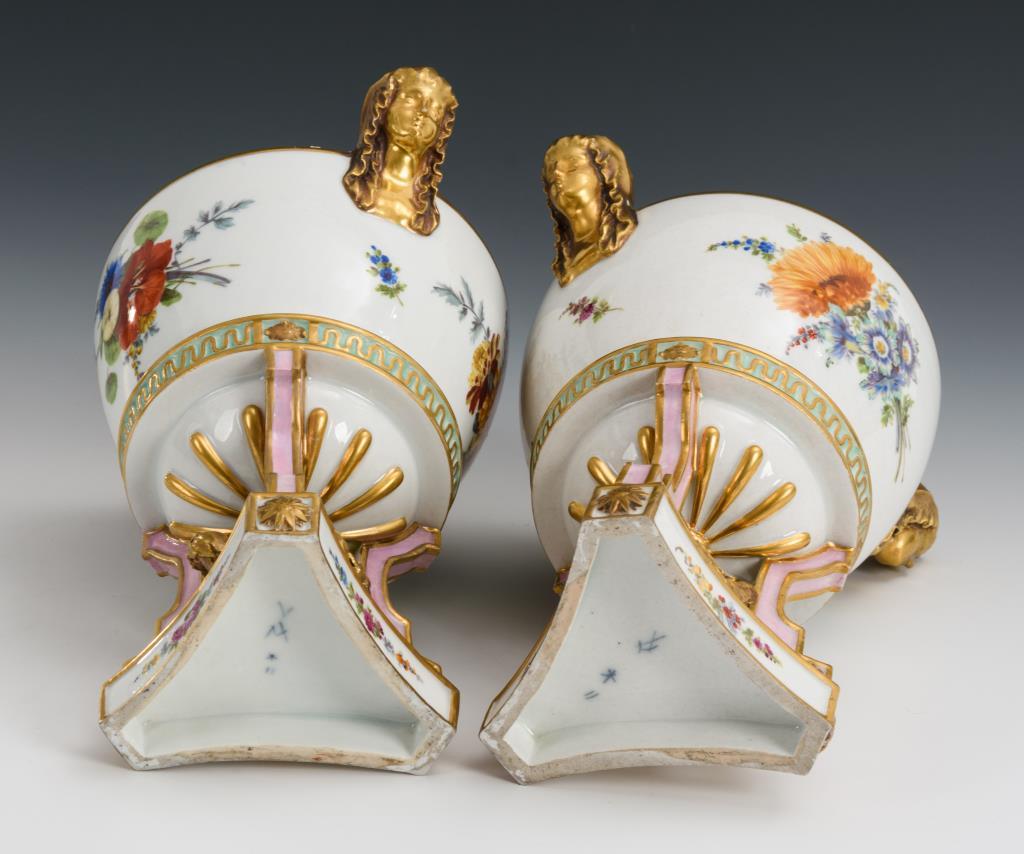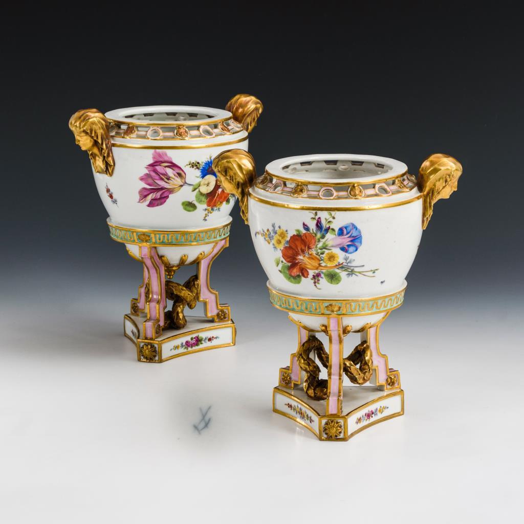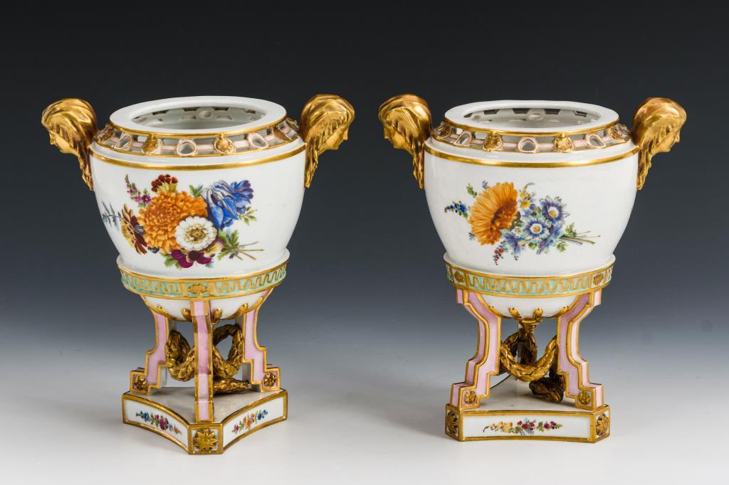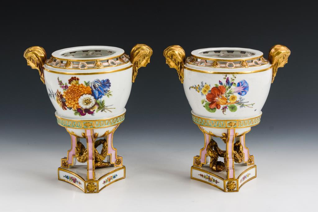 Korpus mit durchbrochener Schulter und zwei Frauenkopfhandhaben, Lorbeergirlande zwischen drei gewinkelten Füßen, dreiseitige Plinthe. Deckel fehlen, 1x Füße restauriert.