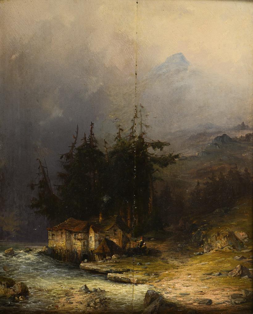 Verwinkeltes Haus am Flussufer mit Staffagefiguren sowie Blick über die Bäume zum dunstigen Gipfel. Geklebter Bruch in der Tafel mit Retuschen, sonst wenig retuschiert.