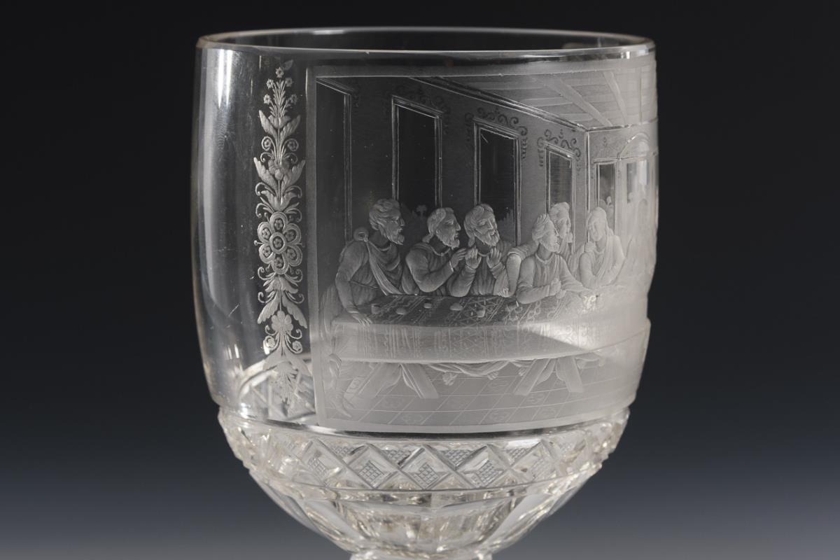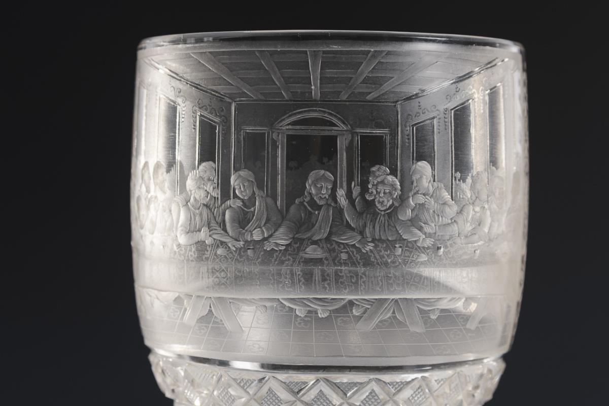 Am Ansatz facettierte Glockenkuppa mit Steinelschliffband und der schauseitigen Darstellung des letzten Abendmahles nach Leonardo da Vinci. Minimale Bestoßungen an den Fußkanten.