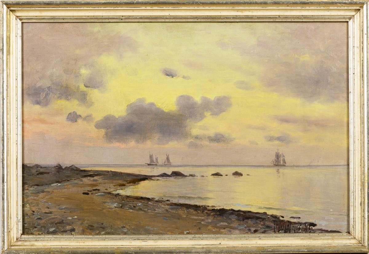 Flacher Strand unter stimmungsvollem Abendhimmel sowie einige Segelschiffe auf dem stillen Meer. 1 kleine restaurierte Stelle mit Hinterklebung.