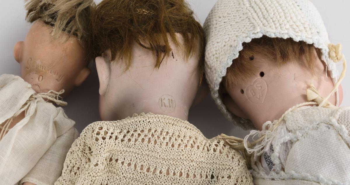 Alle mit Kurbelkopf, Schlafaugen, Mohairperücke, 5-teiligem Sitzbaby-Körper und weißer Kleidung: Kleiner Heubach-Junge (Sonnenmarke 7240). / Babypuppe in Häkelkleidung (Hertel, Schwab & Co für König & Wernicke 179). / Babypuppe (Bruno Schmidt) mit langem Kleid und Rassel. Dazu weißer Korbstuhl. Heubach-Köpfchen restauriert. Körper jeweils mit kleinen Bestoßungen.