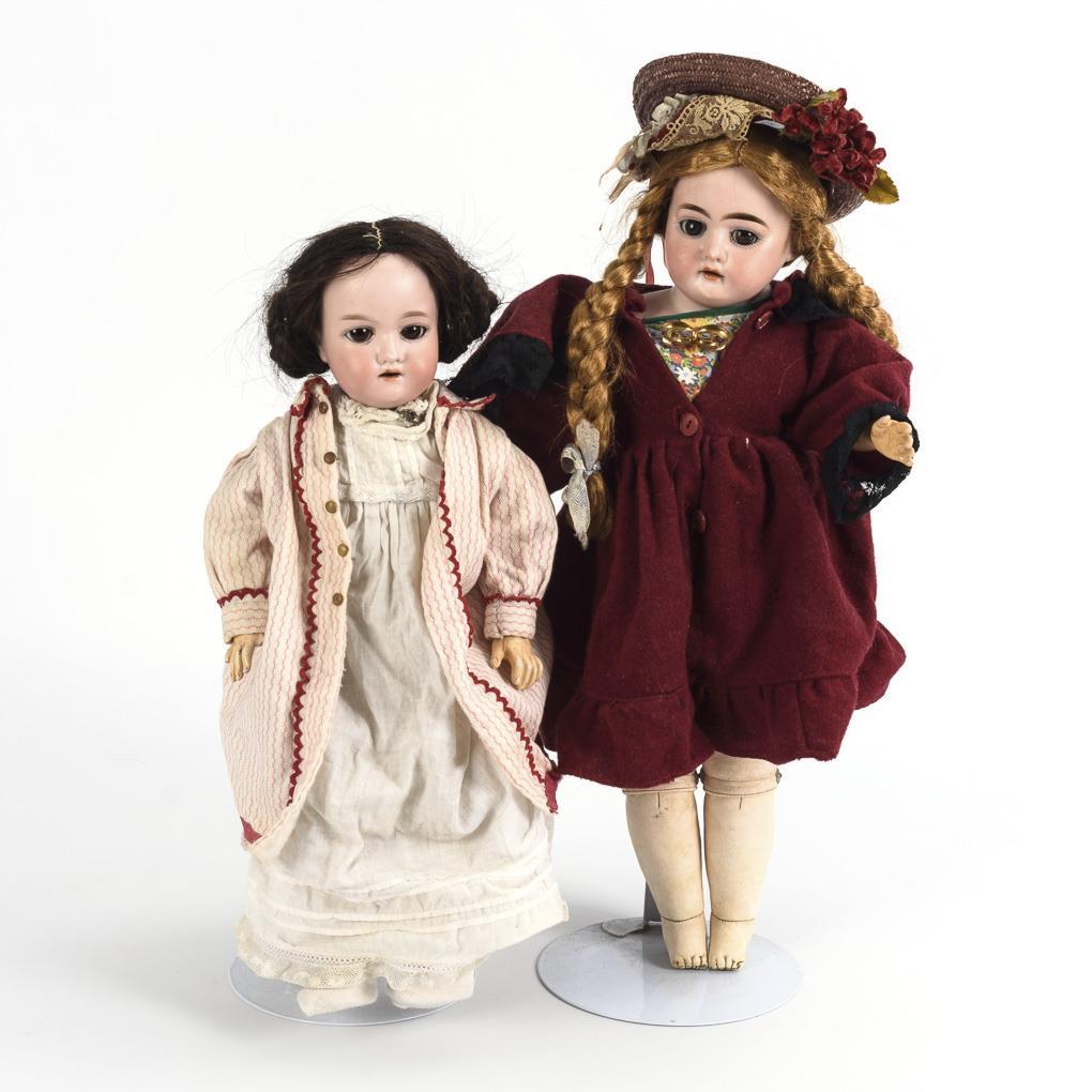 Beide mit braunen Schlafaugen. 1x Kurbelkopf, braune Echthaarperücke, 11-teiliger Gliederkörper, weißes Nachthemd und Morgenmantel. 1x Brustkopf, Kunsthaarperücke mit Zöpfen, Lederkörper, geblümtes Kleid und weinroter Mantel. 390 mit Haarriss und 2 defekten Fingern. 3200 ohne Lider.