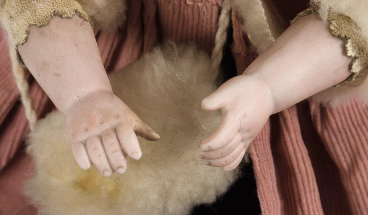Brustkopf, blaue Schlafaugen, braune Echthaarperücke. Lederkörper mit Unterarmen aus Biskuit. Braunes Samtkleid, rosa Cordmantel, schwarzer Strohhut, braune Lederschuhe. Kopf durchleuchtet: ohne Defekte. Rechte Hand restauriert.
