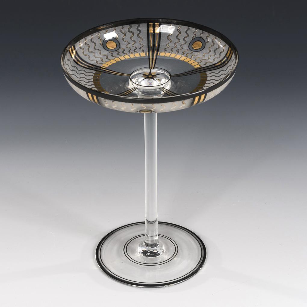 Flache Schale auf hohem Stängel, Rundfuß. Mit einem geometrischen, teils geätzten Dekor.