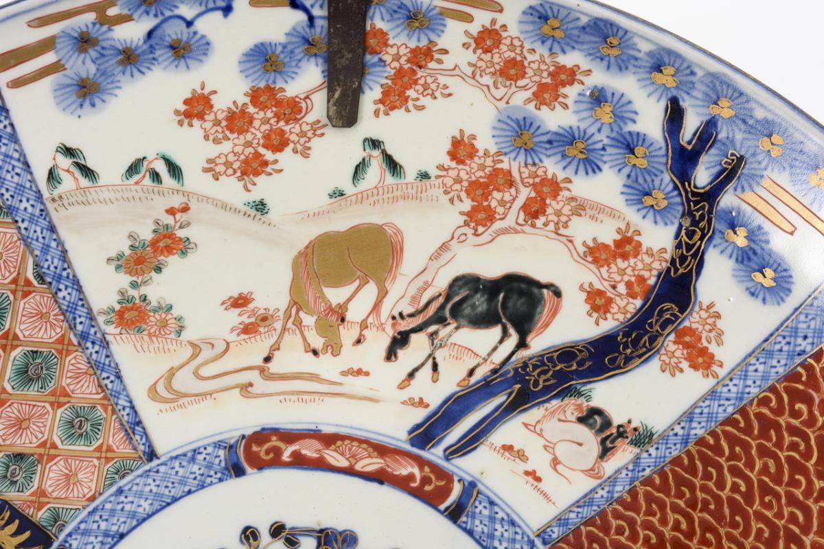 Zwei Bildkartuschen mit grasenden Pferden, zwischen verschiedenen Ornamenten. Unterseite mit Ranken in Unterglasurblau. Wandhalterung.
