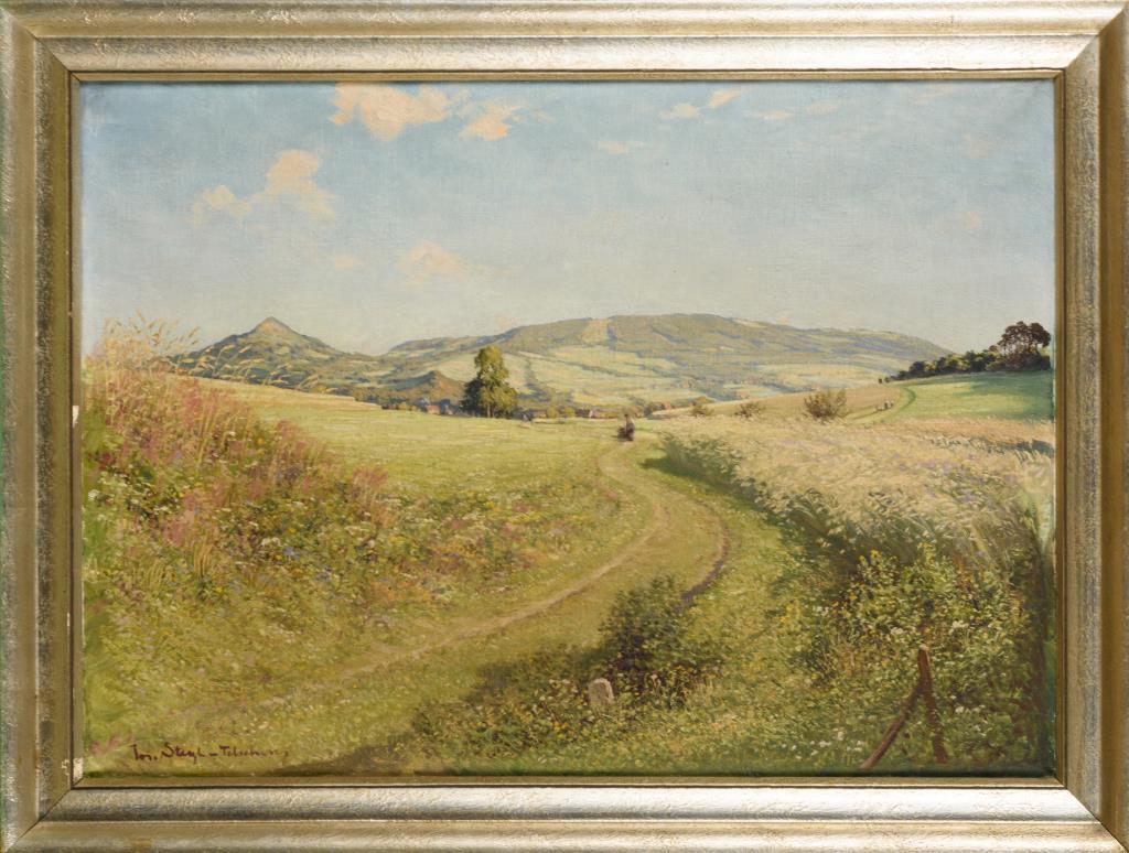 Weite Landschaft mit Bauer auf Feldweg nahe einem Ort, wohl Rosenberg.