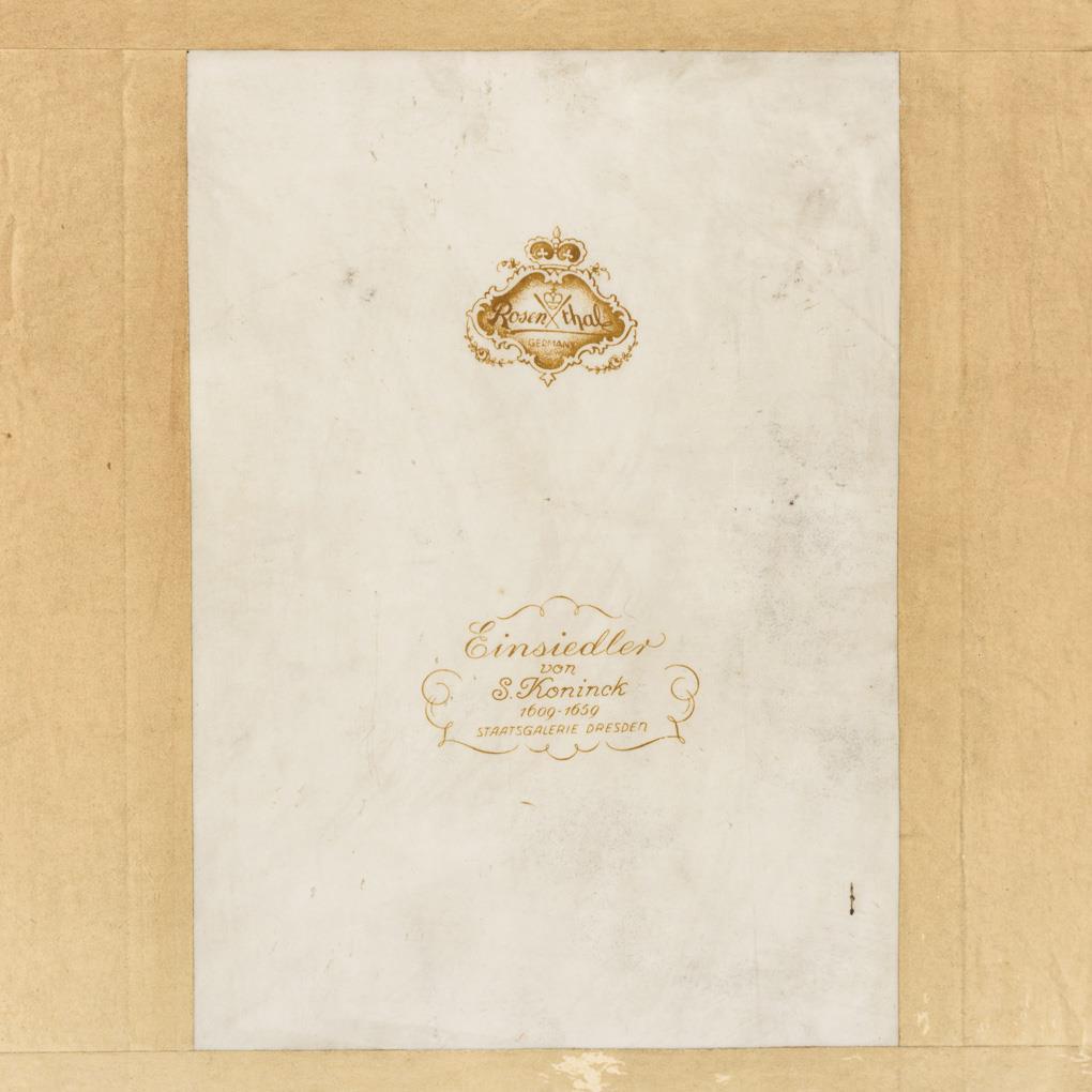 Rechteckige Bildplatte mit der verso bezeichneten Darstellung des in einer Landschaft sitzenden, studierenden Eremiten, nach einem Gemälde von Salomon Koninck (1609-1656).