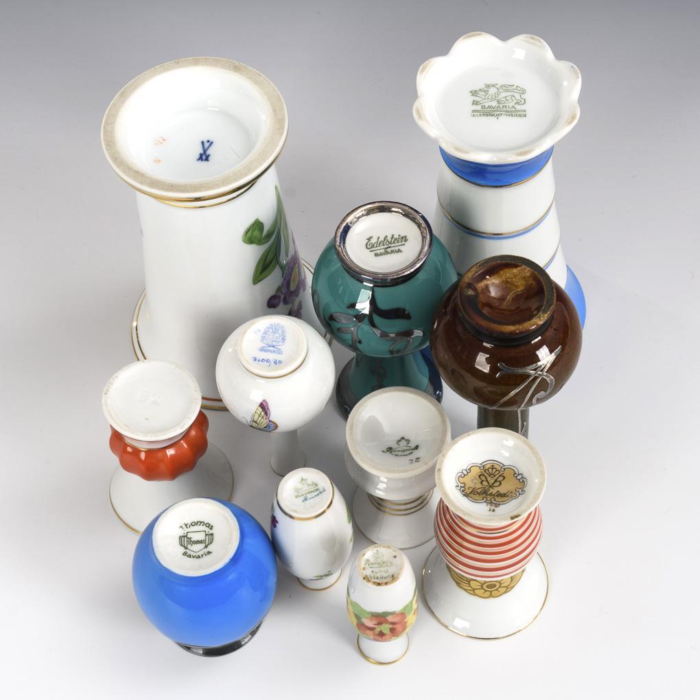 Verschiedene Vasen (u.a. Meissen, Rosenthal, Herend). Verschieden dekoriert (darunter 3x mit Silberoverlay, 1x Blumenmalerei, 2x Blumendekor), 1x Keramik. Partieller Goldabrieb.