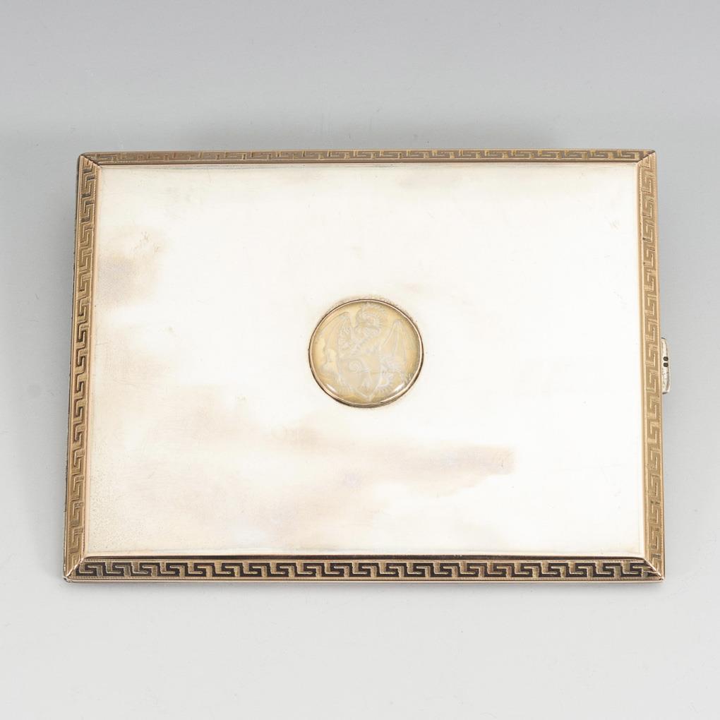 Elegantes Etui mit umlaufendem Mäanderband. Auf dem Deckel Cabochon aus Bergkristall? mit graviertem Wappentier. Innen vergoldet, mit Widmung: "1.IX.15 - 15.X. 27". Unterseitig 1 kleine Delle.