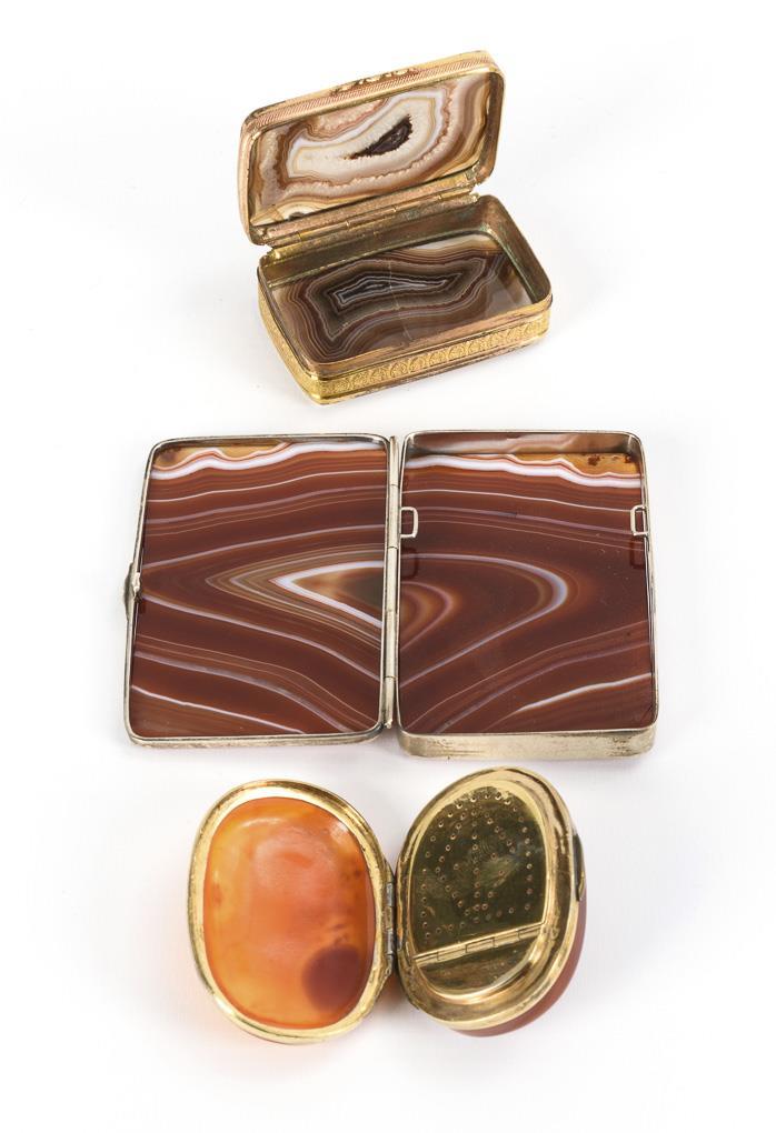 Zigarettenetui mit Silbermontierung, ovale Vinaigrette mit silbervergoldeter Montierung und Binnendeckel, vergoldete Dose "a deux couleur". Je Boden und Deckel aus Achat. 1 Achatboden gesprungen, Scharnier der Vinaigrette fachgerecht repariert.