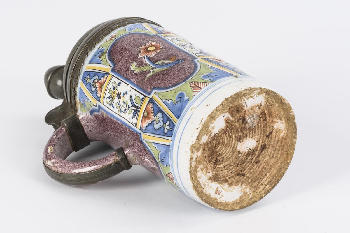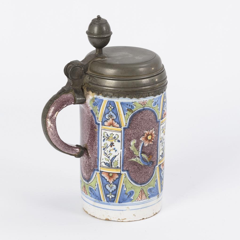 Zylinderkrug mit Bandhenkel. Umlaufender Nischendekor mit einzelnen Blumen auf manganjaspiertem Grund. Zinndeckel mit Kugeldrücker und Henkelband. Leicht bestoßen, feine Risse, Glasurbereibungen, Zinn partiell defekt.