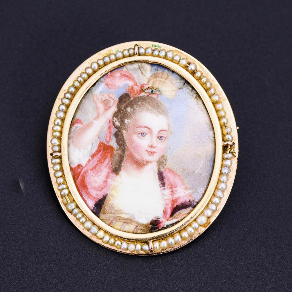 Zargengefasste Miniatur eines Mädchen mit Kopfputz. Zierrand mit Perlchen. Hakenverschluss. 1 Perlchen defekt, Malerei berieben. Platte an Oberseite haarrissig.