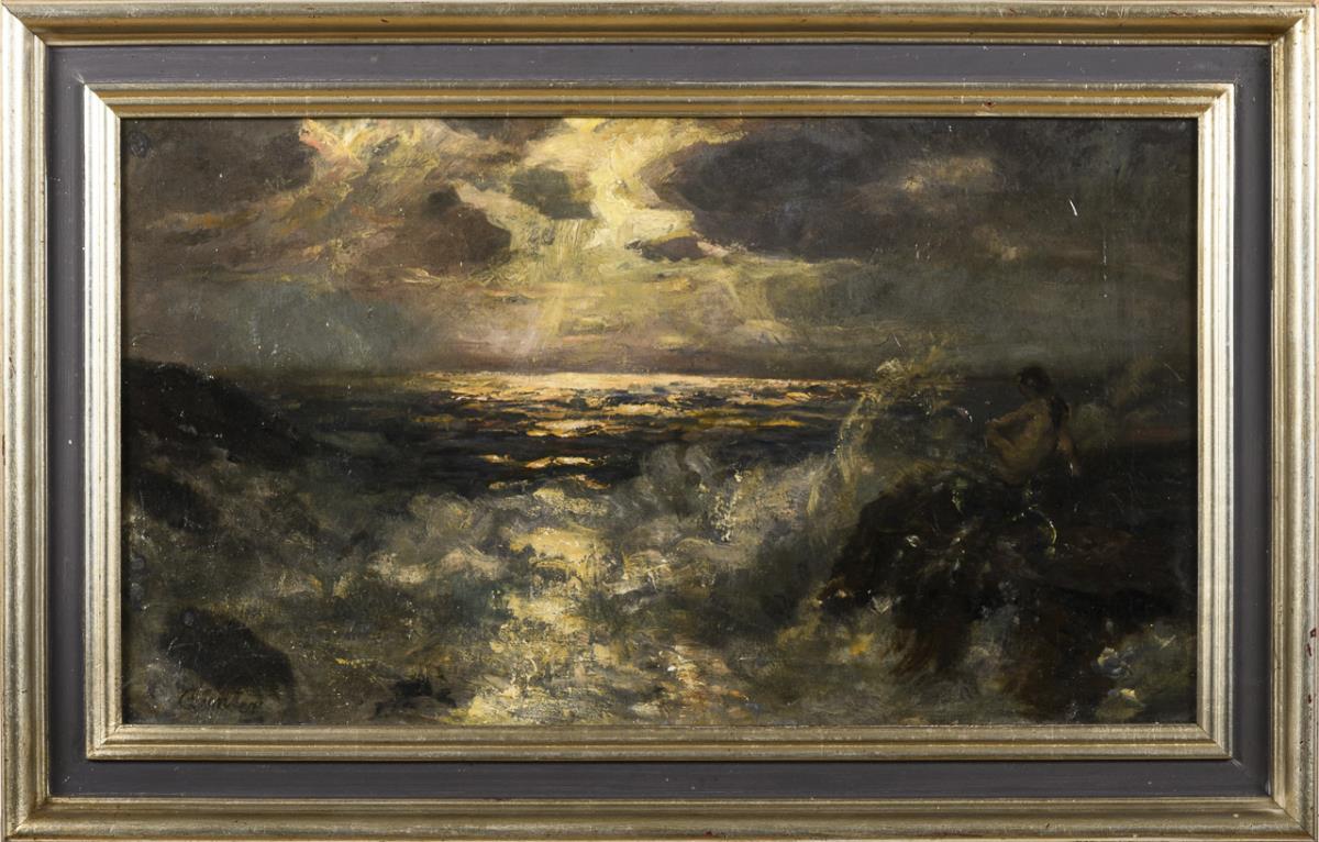 Felsiges Ufer mit sitzendem Akt, brechenden Wellen und einfallendem Sonnenlicht durch die dunklen Sturmwolken. Leichte Alterspuren.