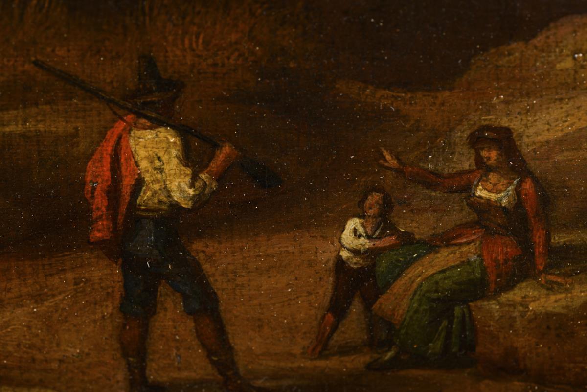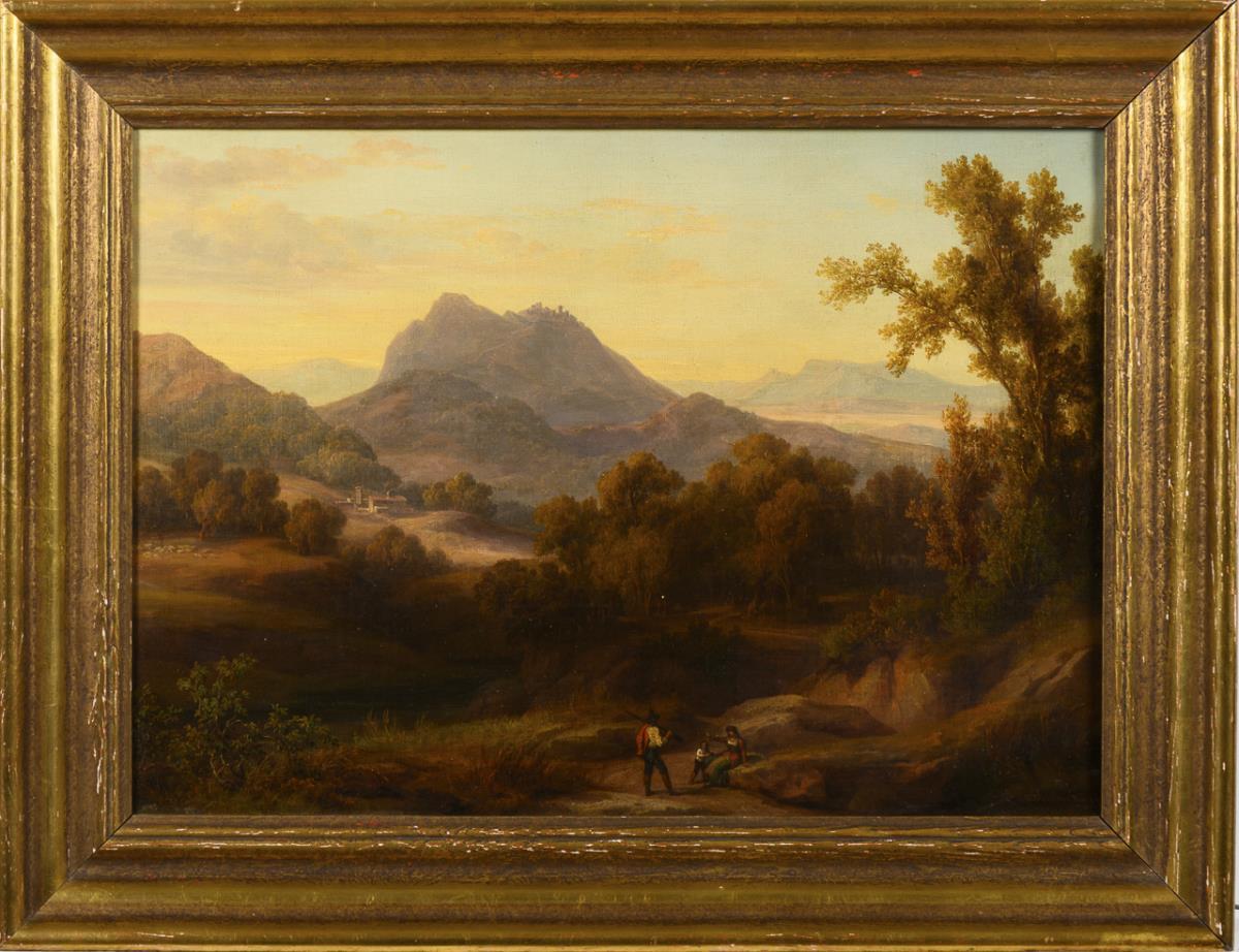 Staffagefiguren in bergiger Landschaft mit Landgut und Burganlage auf dem Berg in idyllischem Sonnenlicht. Kleine restaurierte Stellen mit Hinterklebungen.