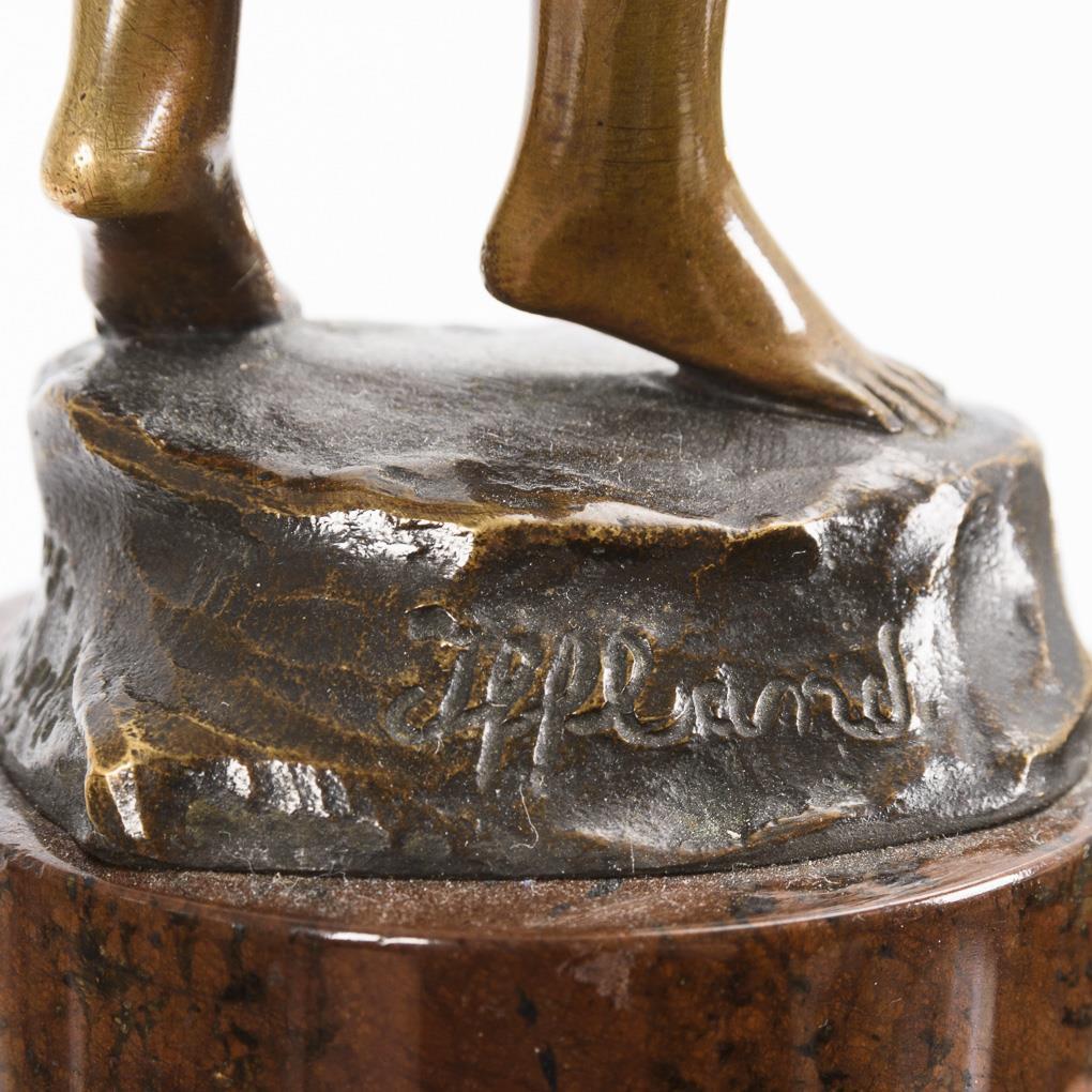 Bronze patiniert, brauner Marmor-Rundsockel. Bezeichnet, Gießermarke "Akt:Ges. Gladenbeck Berlin". H 19 / 24 cm.
