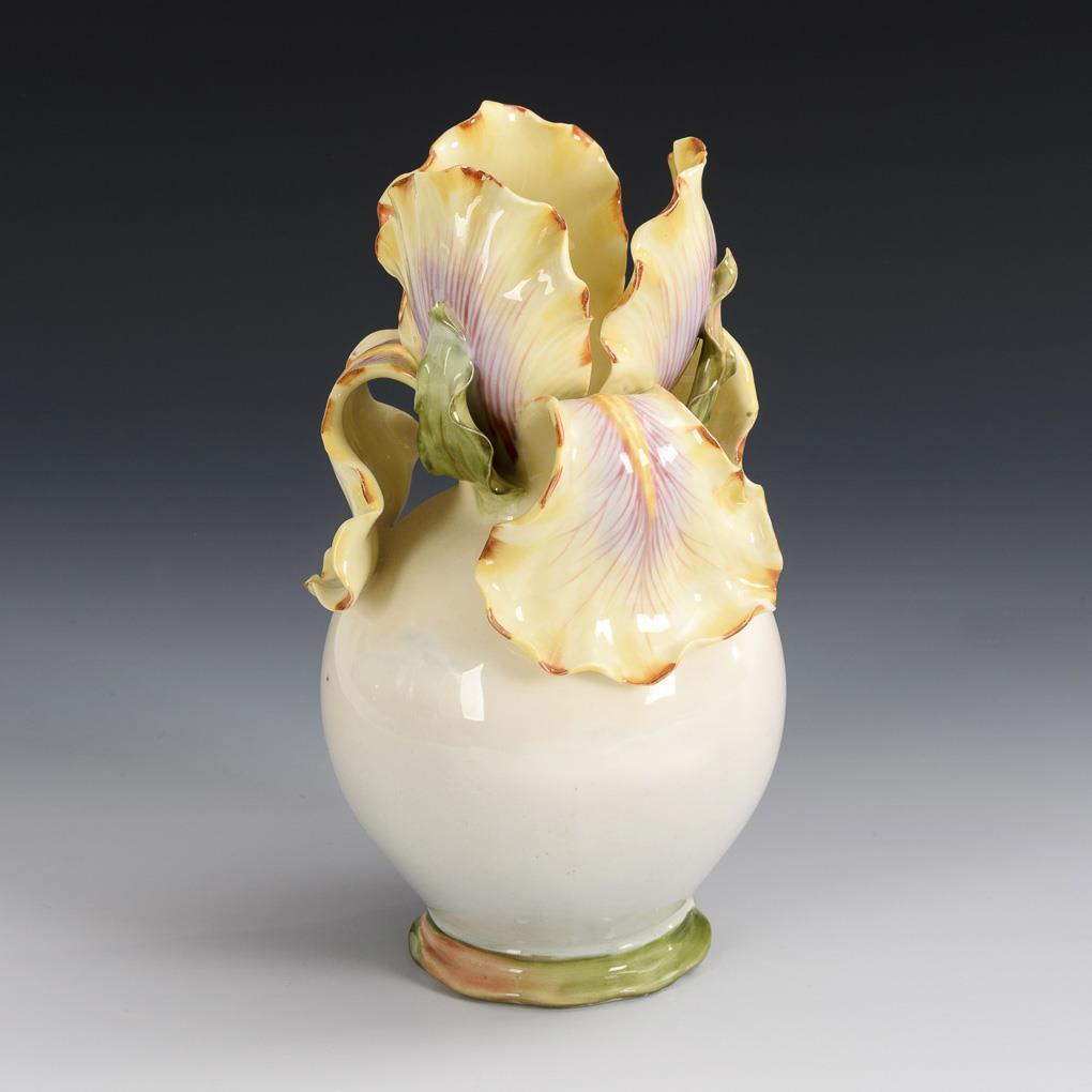 Bauchige Vase mit einer gelben Irisblüte als Mündungsrand. Chip an 1 Blütenblatt, 1 Blattspitze bestoßen.