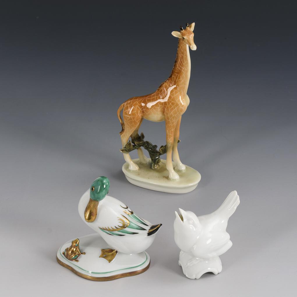 3 Miniaturtiere: Giraffe, Spatz und Ente.