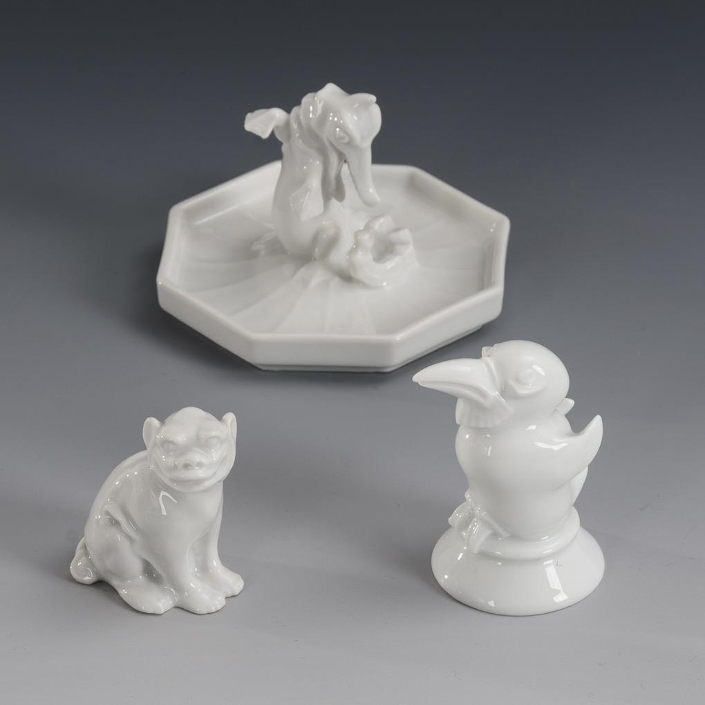 1x Krokodil in oktogonaler Schale, Modell-Nr. 36, Entwurf von Karl Himmelstoss, bezeichnet. / 1x Pinguin, Modell-Nr. 918, Entwurf von Hans Küster, bezeichnet. / 1x Fohund, Modell-Nr. 69.