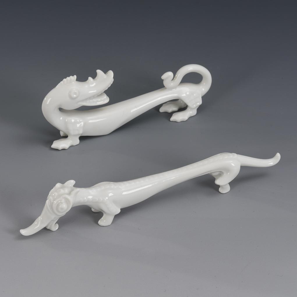 Im Stil von Messerbänkchen gestaltete, weiße, groteske Tiere. Rechter Vorderfuß des Axolotl bestoßen.