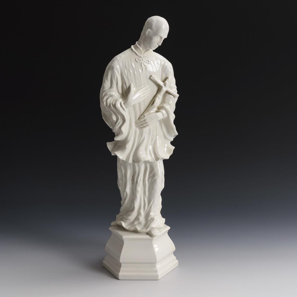 Zeitgenössische Darstellung einer männlichen Heiligenfigur mit Christuskreuz, auf hohem Profilsockel. Minimale Glasurchips am Sockel und am Saum.