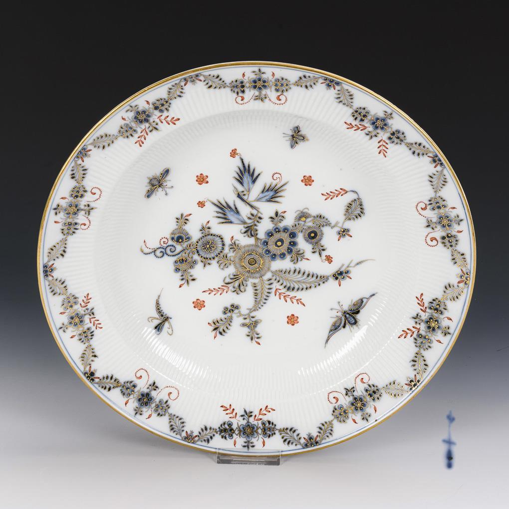 Unterglasurblau bemalt, rot und gold gehöht. Ø 38 cm.