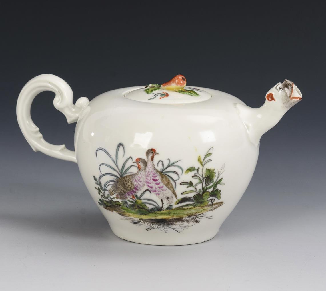 Bauchiges Kännchen mit Rocaillehenkel, Tierkopf-Röhrenausguss und Birnenknaufdeckel. Beidseitig die Darstellung einer Landschaftsinsel mit exotischem Geflügel. Restaurierter Wandungshaarriss.
