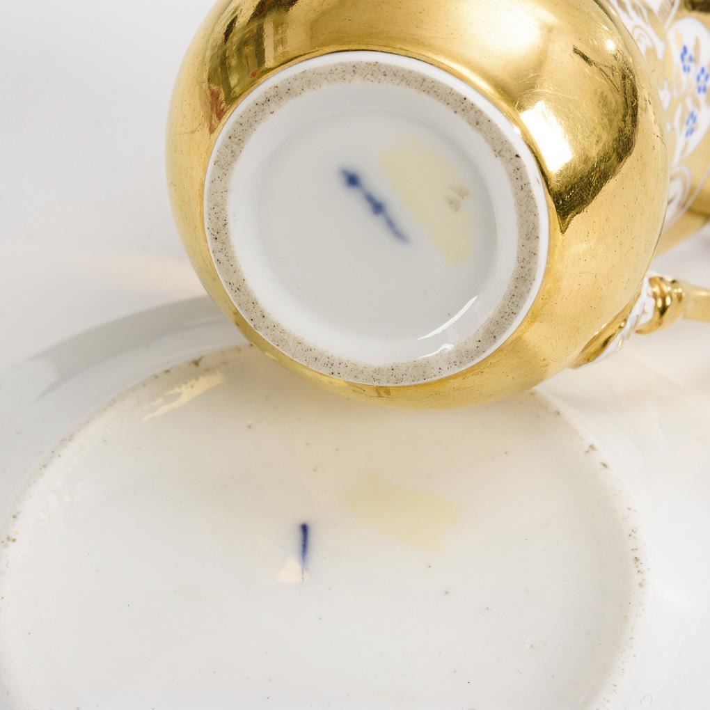 Überwiegend Goldstaffage. H Tasse 9,5 cm, Ø ergänzte Untertasse 15 cm.