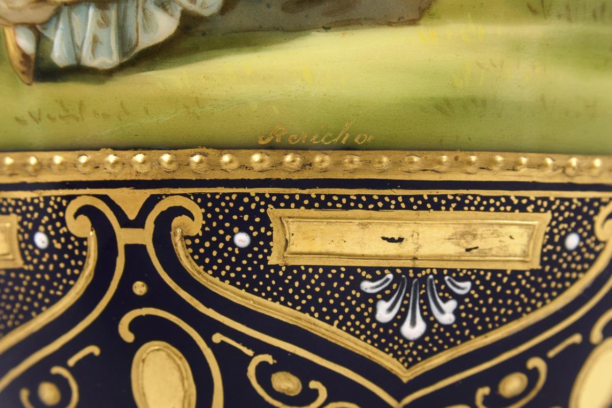 Ovoider Korpus mit zwei gewinkelten Henkeln, Rundfuß, Quadratplinthe, auf Messingsockel, mit montierter Lampenfassung und Resten einer Verkabelung. Kobaltfond mit reicher ornamentaler Goldreliefmalerei und Juwelenmalerei. Auf dem Korpus eine Landschaft mit mythologischen Figuren. Korpusansatz restauriert.