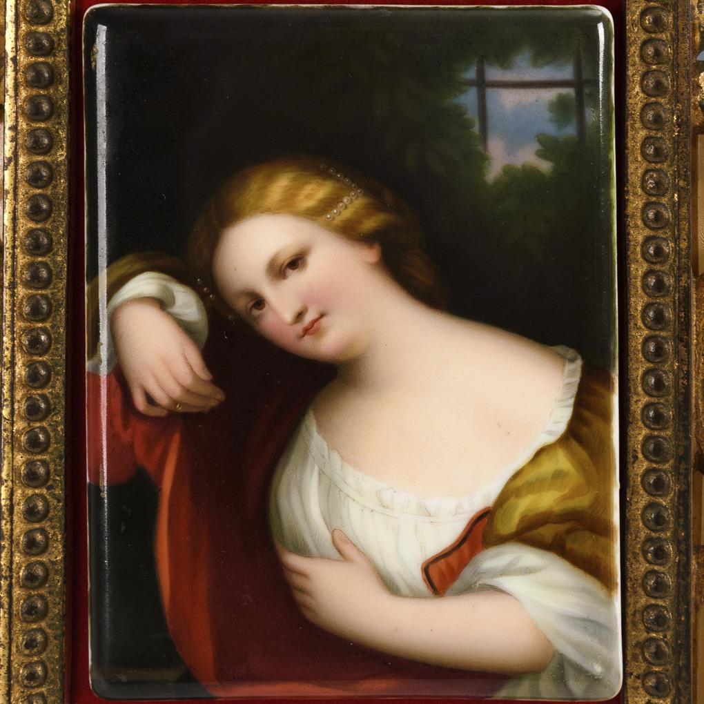 Rechteckige Platte mit dem Porträt einer sitzenden Dame mit rotem Umhang, nach einem Gemälde des italienischen Malers Palma il Vecchio (um 1480 - 1528).