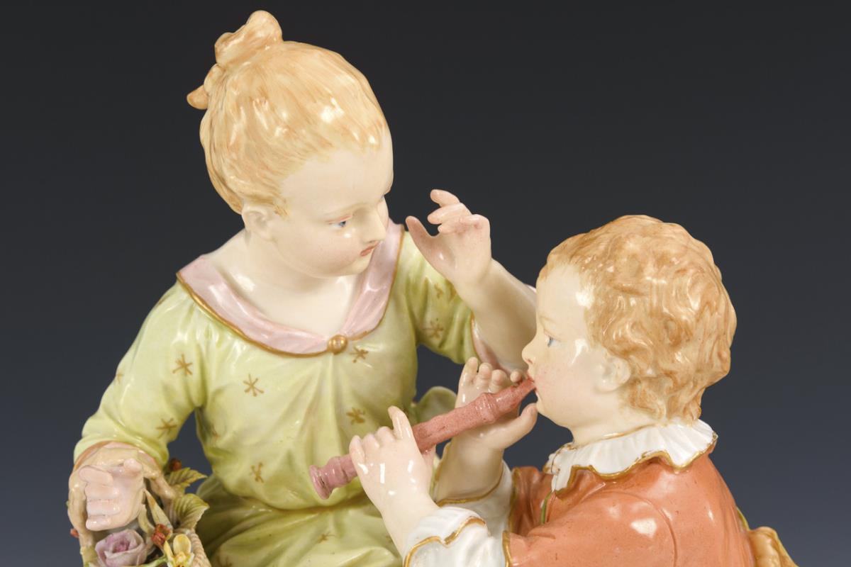 1x kniender, einem sitzenden Mädchen ein Vogelnest reichender Knabe. / 1x flötespielender Knabe und Mädchen mit Blumenkorb. 1x Kopf und linke Hand des Mädchens sowie Vogelnest restauriert, 1x Flöte und linke Hand des Knaben sowie rechter Fuß und rechte Hand des Mädchens und Sockelrand restauriert.