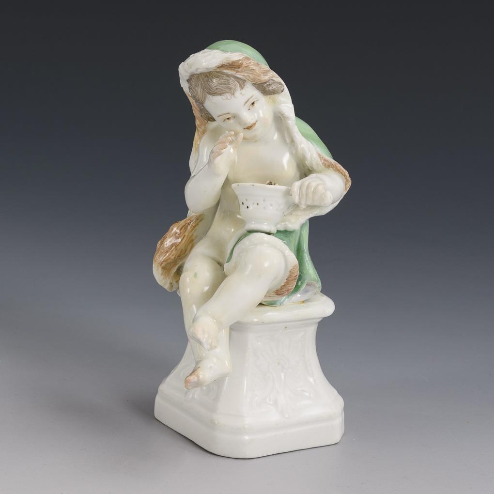 Auf einem kleinen Postament sitzender Putto mit Feuerschale. Beide Fußspitzen, linke Hand und Umhang restauriert.