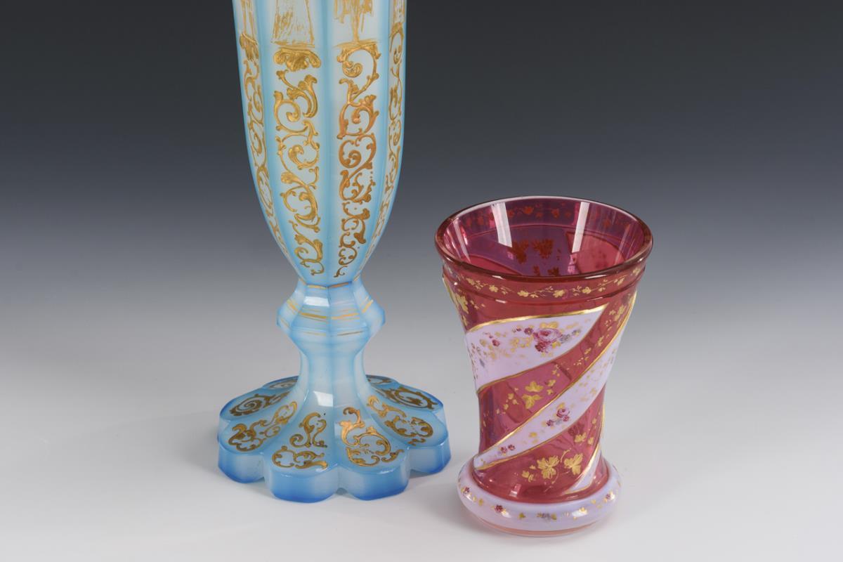 1x facettierte, gefußte Vase aus farblosem Glas mit hellblauem Überfang und Goldreliefmalerei. / 1x Kraterbecher aus farblosem Glas mit rosa Innenfang, opalweißem Überfang und farbiger und goldener Floralmalerei. Vase mit Rand- und Fußbestoßungen.