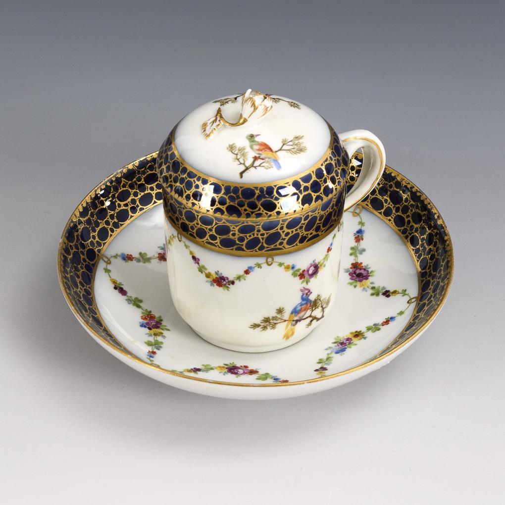 Zylindrische Tasse mit gewundenem Henkel und Blütenknaufdeckel. Unter einer ornamental goldstaffierten Kobaltbordüre Blumengirlanden sowie Zweige mit einem exotischen Vogel. Deckelknauf bestoßen, restaurierter Wandungshaarriss.