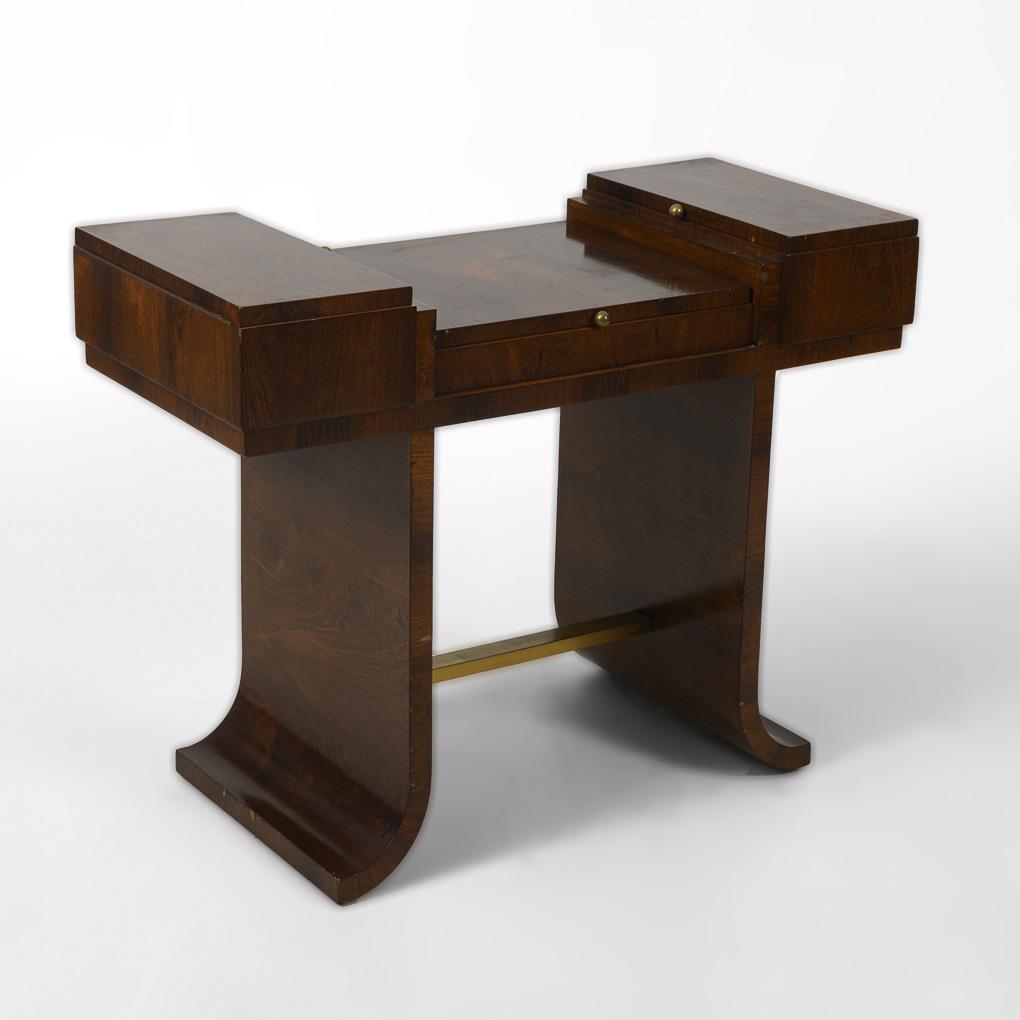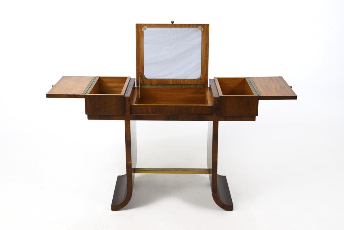 Zierlicher Toilettentisch in Brettbauweise auf 2 nach unten ausgestellten Seitenteilen und Messing-Fußsteg, mit mittig aufstellbarem Spiegel und 2 seitlichen aufklappbaren Fächern; akzentuiert mit Messing-Kugelgriffen. Alters-/Gebrauchsspuren, Furnier mit kleinen Defekten.