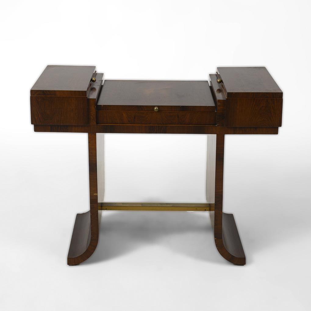 Zierlicher Toilettentisch in Brettbauweise auf 2 nach unten ausgestellten Seitenteilen und Messing-Fußsteg, mit mittig aufstellbarem Spiegel und 2 seitlichen aufklappbaren Fächern; akzentuiert mit Messing-Kugelgriffen. Alters-/Gebrauchsspuren, Furnier mit kleinen Defekten.