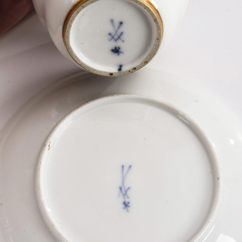 Polychrom bemalt, goldstaffiert. H Tasse 10,5 cm, Ø originale Untertasse 13,5 cm.