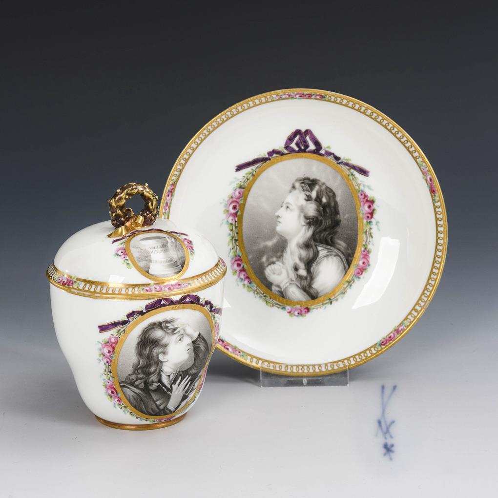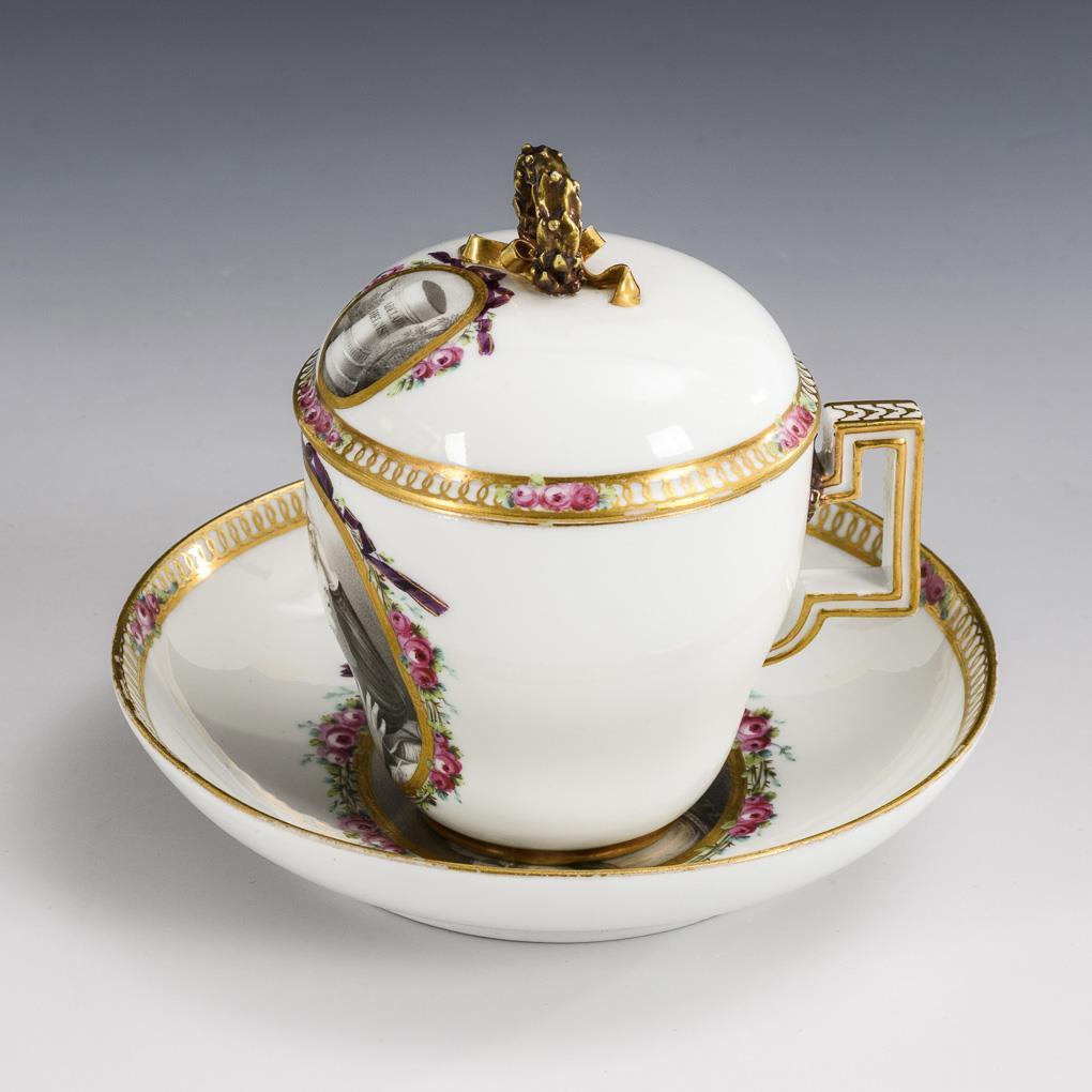 Glockentasse mit gewinkeltem Henkel, Deckel mit Lorbeerkranzknauf. Auf der Tasse die grisaillegemalte Darstellung des jungen Abelard sowie auf der Untertasse die Darstellung der Heloise, auf dem Deckel eine Gedenksäule mit der Aufschrift "Abelard / Heloise". Darstellung im Untertassenspiegel etwas berieben, Goldränder etwas berieben.