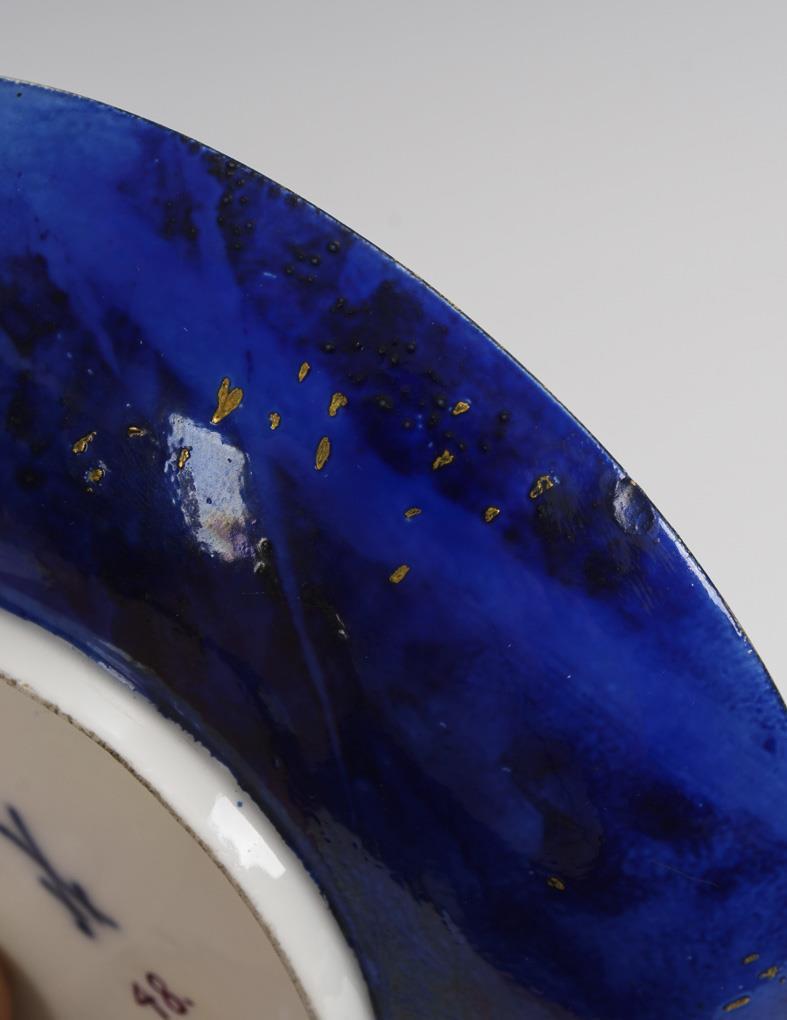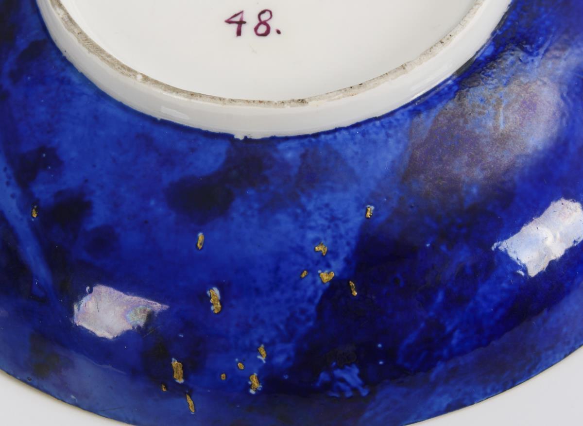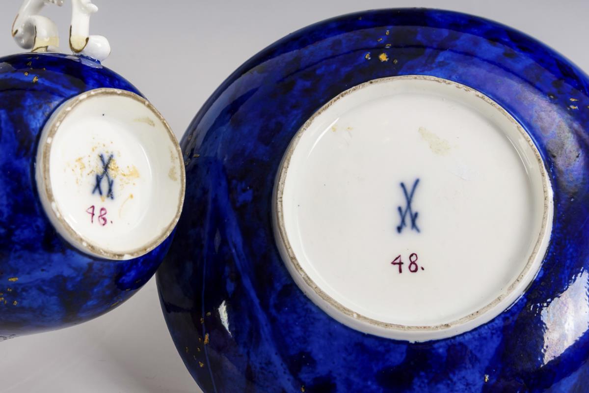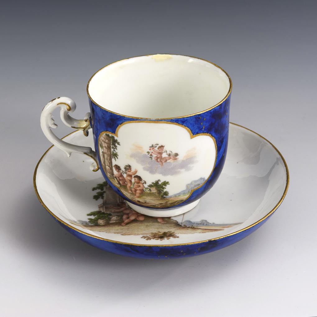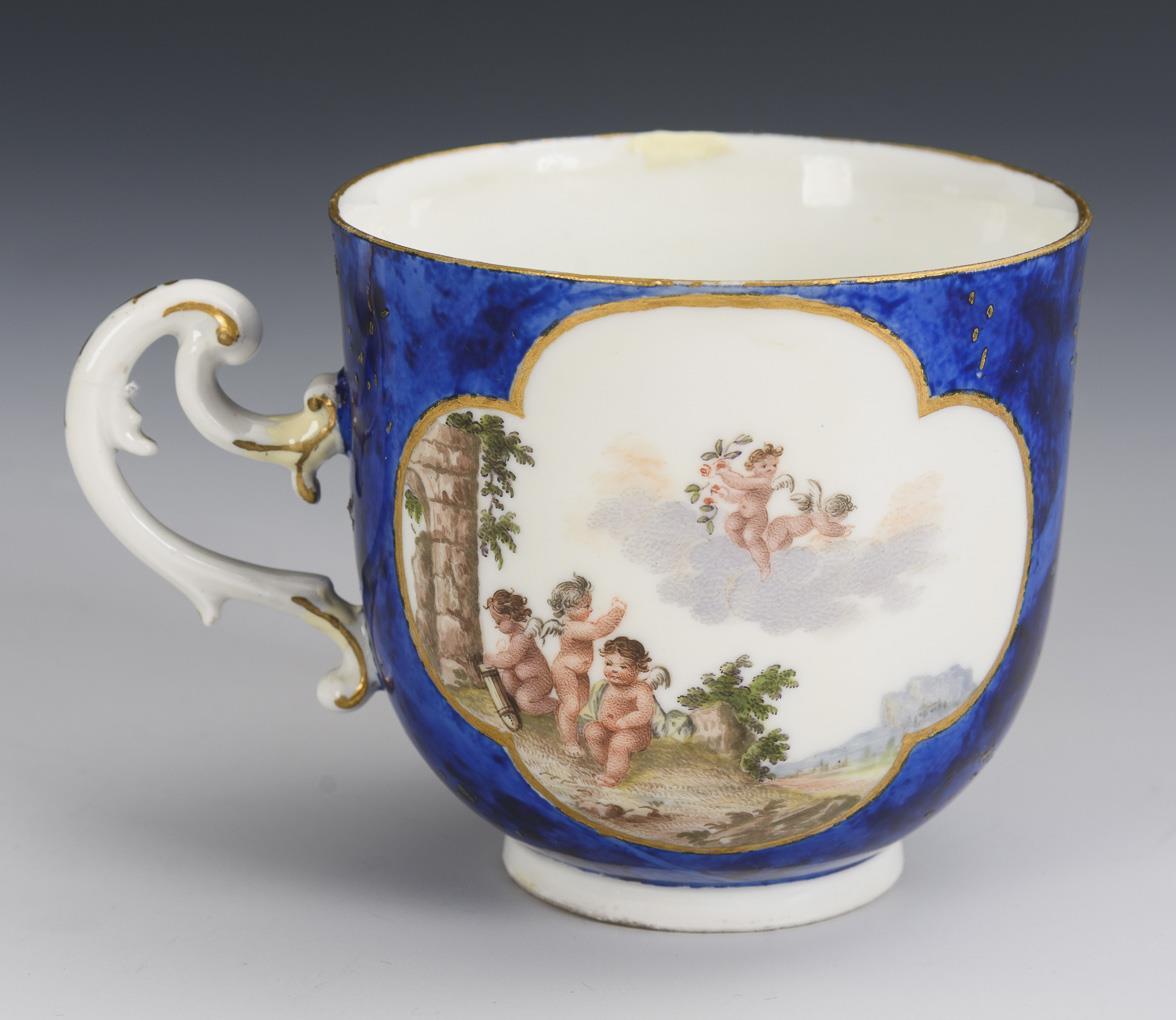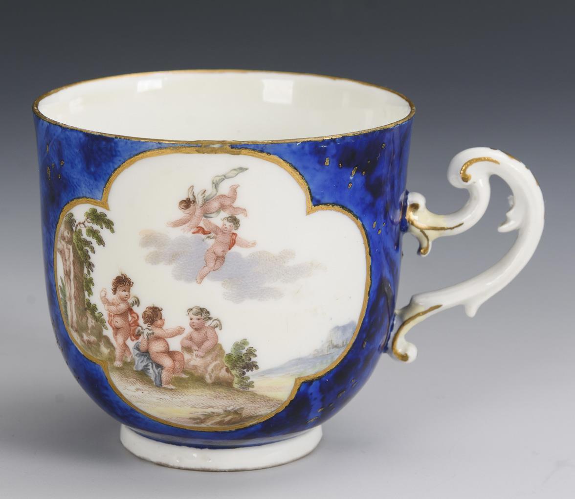 Glockentasse mit Rocaillehenkel. Blauer, marmorierter Fond mit Goldpunkten, beidseitig auf der Tasse eine Vierpasskartusche mit fein gemalten Puttenszenen. Henkel restauriert, farbretuschierter Chip am Untertassenrand, Restaurierung am Tassenrand.