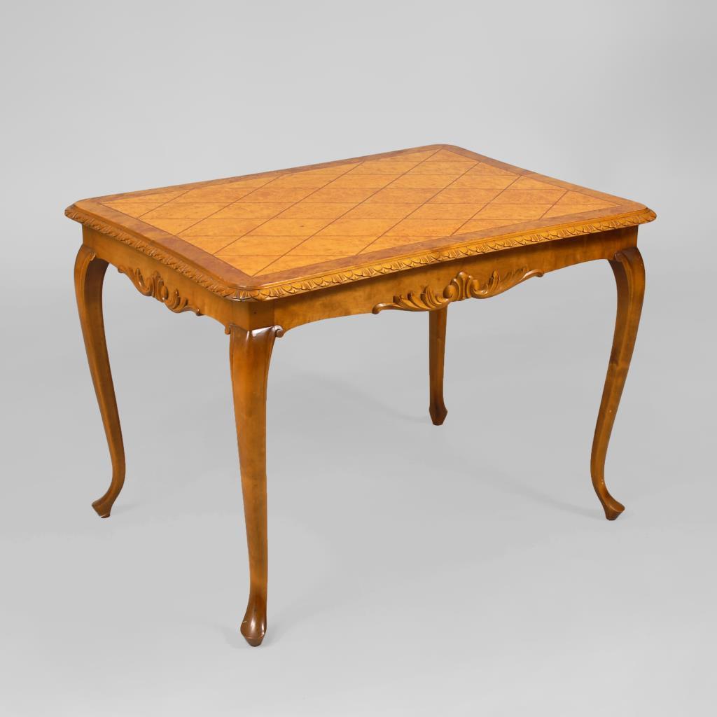 Höhen- und längenverstellbarer rechteckiger Tisch auf 4 geschwungenen Beinen, Tischplatte mit Rautenmarketerie und rocaillenverzierten Zargen. Alters-/Gebrauchsspuren, 2 Einlegeplatten fehlen.