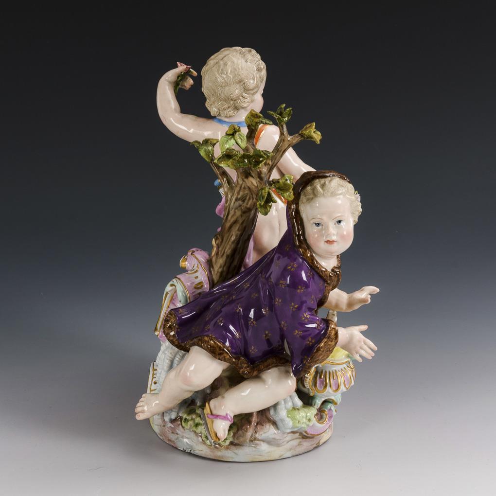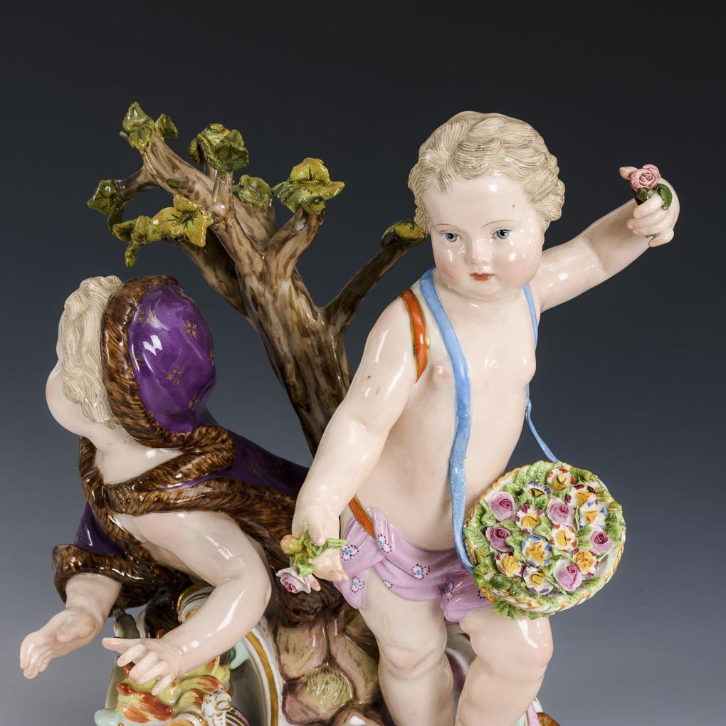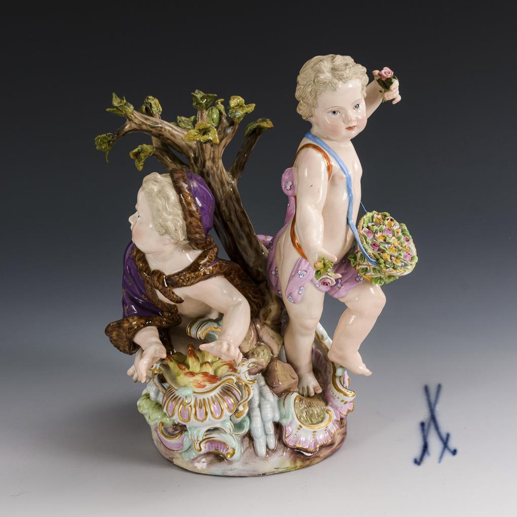 Putto mit Blumenkorb als Allegorie des Frühlings und Putto mit Feuerschale und Pelzumhang als Allegorie des Winters. Einige Blätter, Blüten und Band des Blumenkorbes restauriert, einige Blüten und Blätter bestoßen.
