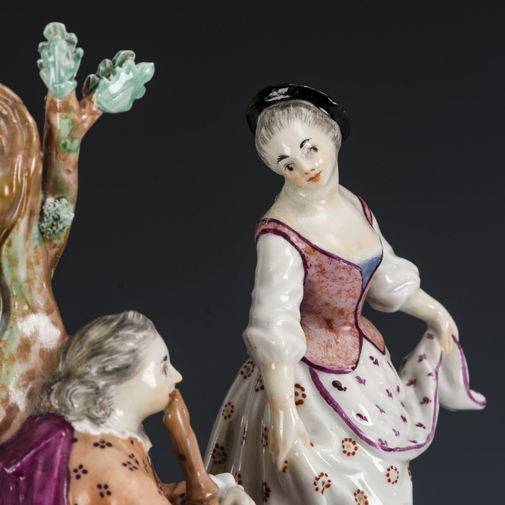 An einem Baum sitzender, eine Flöte spielender junger Mann sowie eine zur Musik der Flöte tanzende junge Frau. Chip am Sockelrand, Füße, Hut und Zweige mit Blättern restauriert, Brandriss im Hals des Mannes und am rechten Handgelenk der Frau.