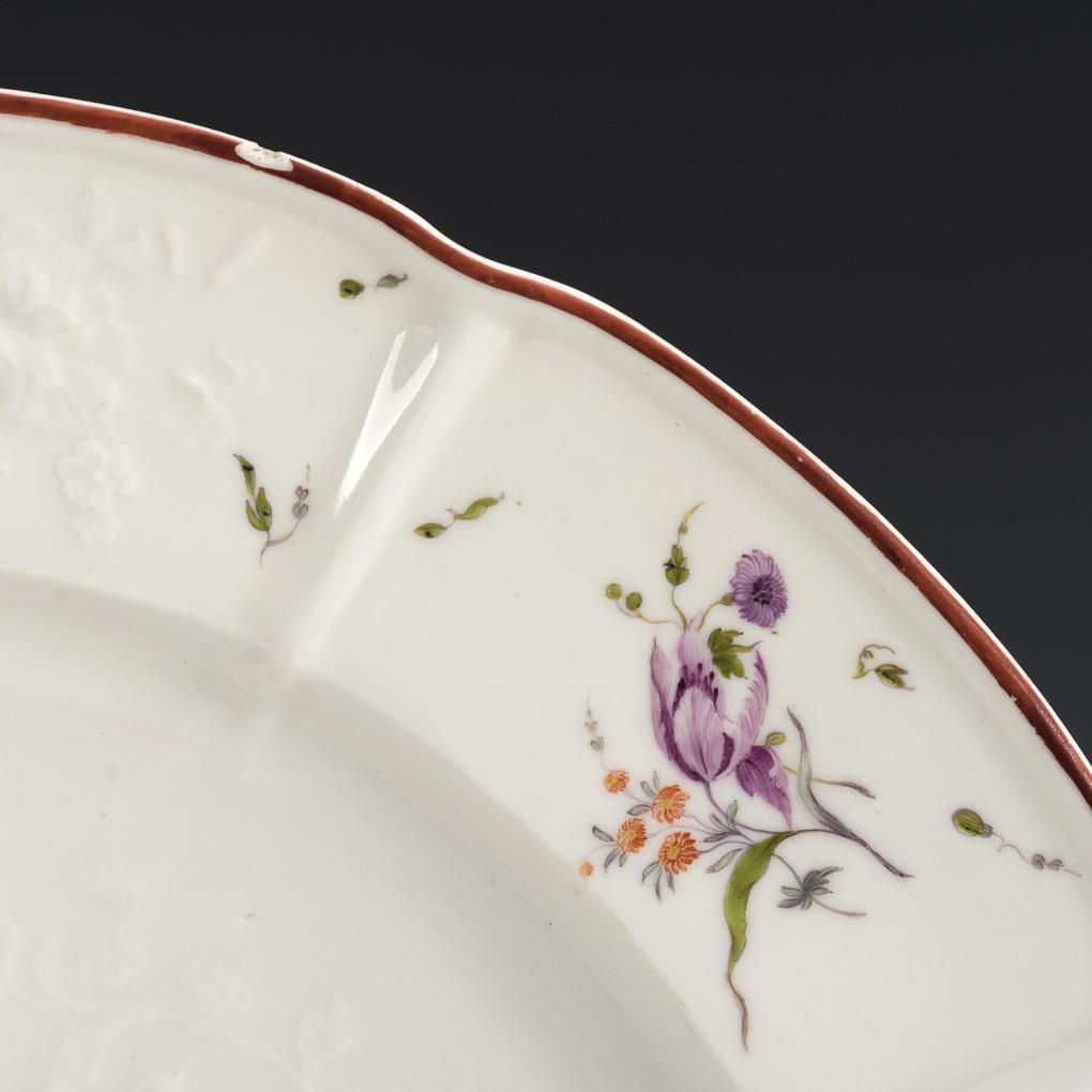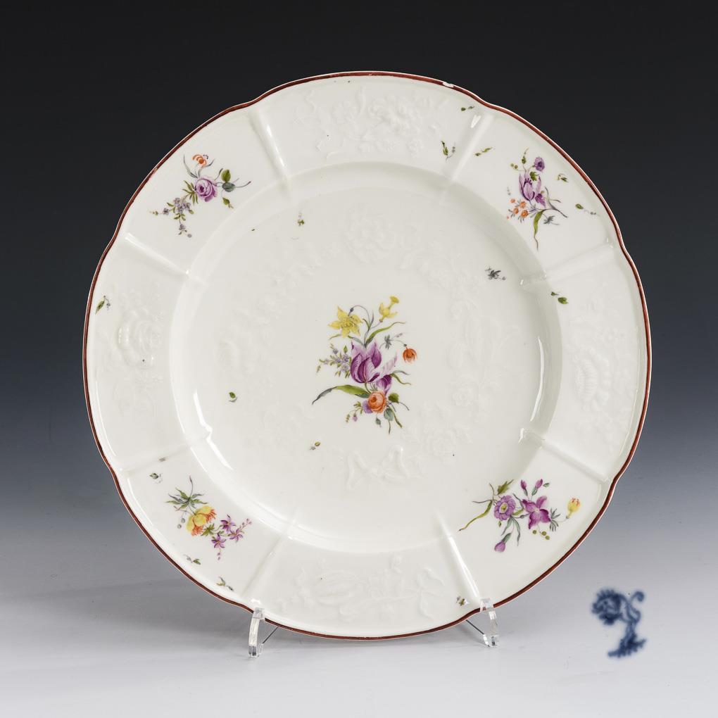 Speiseteller mit Floralrelief und einem Blumenbukett mit Tulpe, Narzisse und Rose im Spiegel. 1 Randbestoßung.