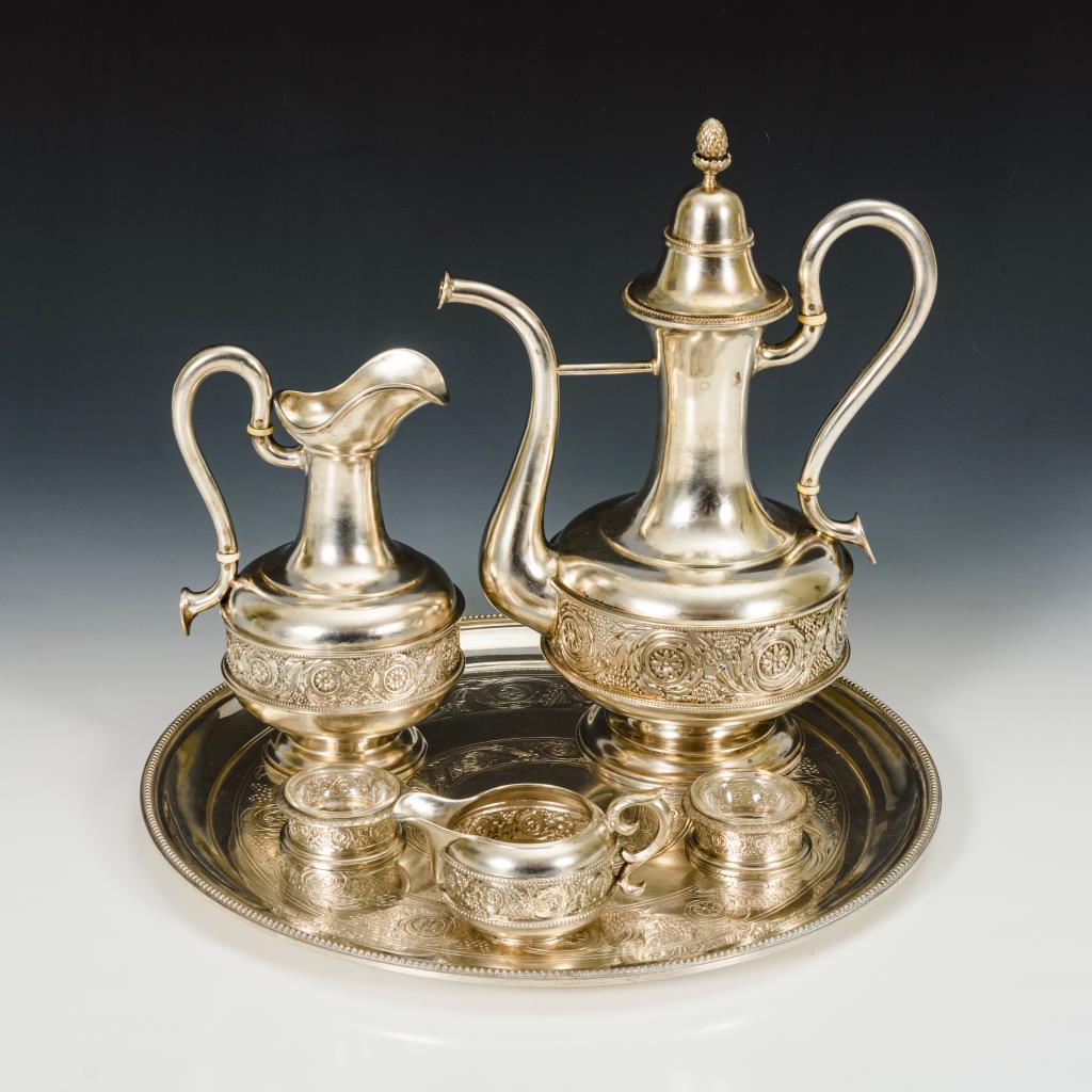 6-teiliges Kernstück mit antikisierendem Relieffries: Mokkakanne, Wasserkanne, Milchkännchen, 2 Zuckerschälchen und rundes Tablett. Gebrauchsspuren, teils etwas gedellt.