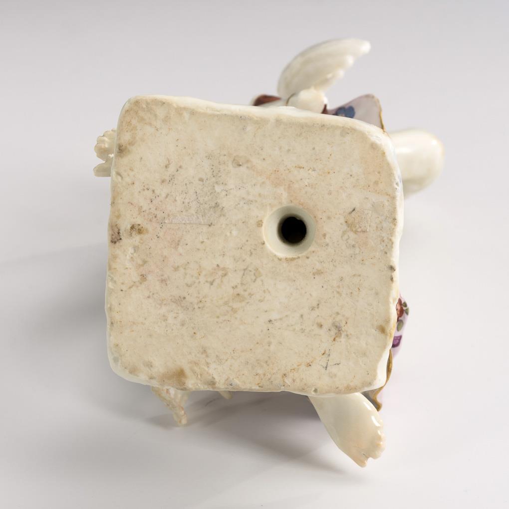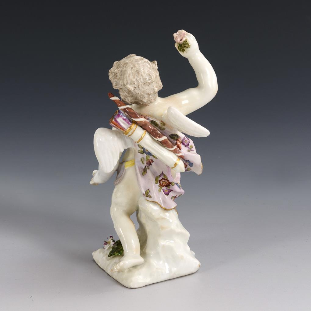 An einem Felssockel tanzender Amorknabe mit Köcher und Bogen. Beide Flügel- und Armansätze restauriert, Blüte am Sockel bestoßen, Blattfehlstellen am Sockel farbretuschiert.