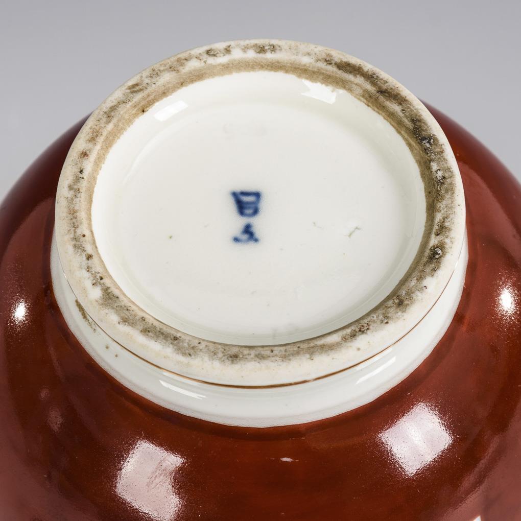 Birnkanne mit Birnenknaufdeckel. Rotbrauner Teilfond, beidseitig eine Kartusche mit einer grisaillegemalten Landschaftsinsel mit Monumenten. Partieller Goldabrieb.