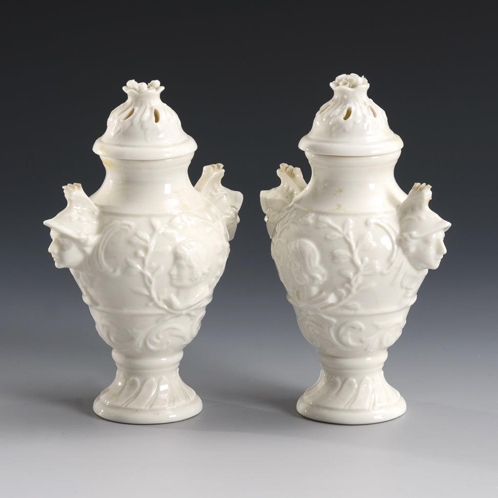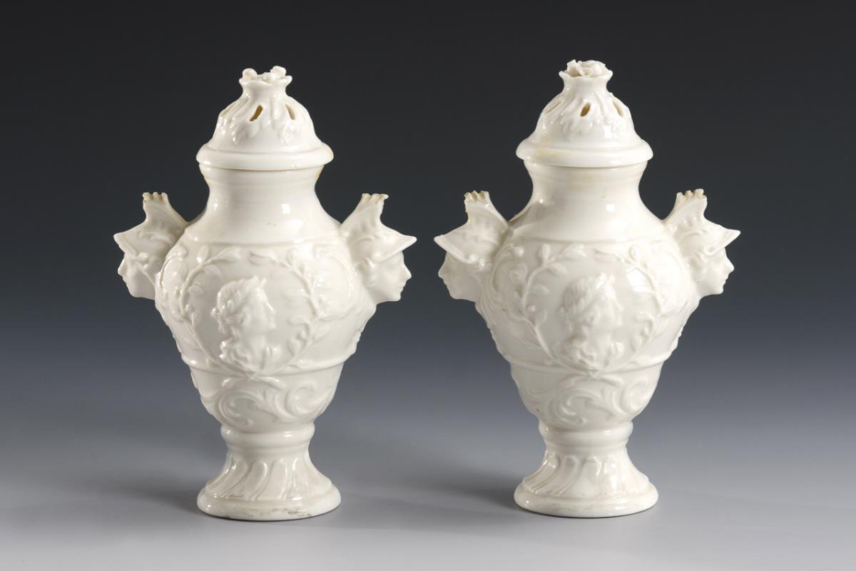 Balustervasen mit zwei behelmten Maskaronen als Handhaben, durchbrochen gearbeitetem Blütenknaufdeckel und Rundfuß. Beidseitig in einem Lorbeerkranz ein antikes Reliefporträt. 1 Helmspitze bestoßen, kleine Bestoßungen an den Deckelknäufen.