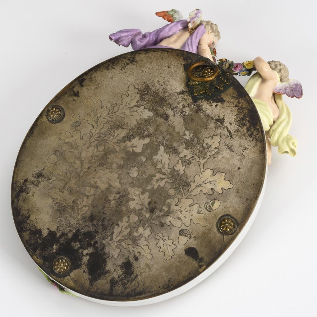 Ovaler Spiegel mit zwei bekrönenden Putten. Bestoßungen am Belag, 1 Flügel geklebt und bestoßen.