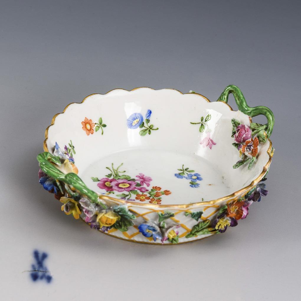 Kleine Korbschale mit Blütenbelag, zwei Asthenkeln und Blütenbelag. Henkel restauriert, Bestoßungen am Belag.