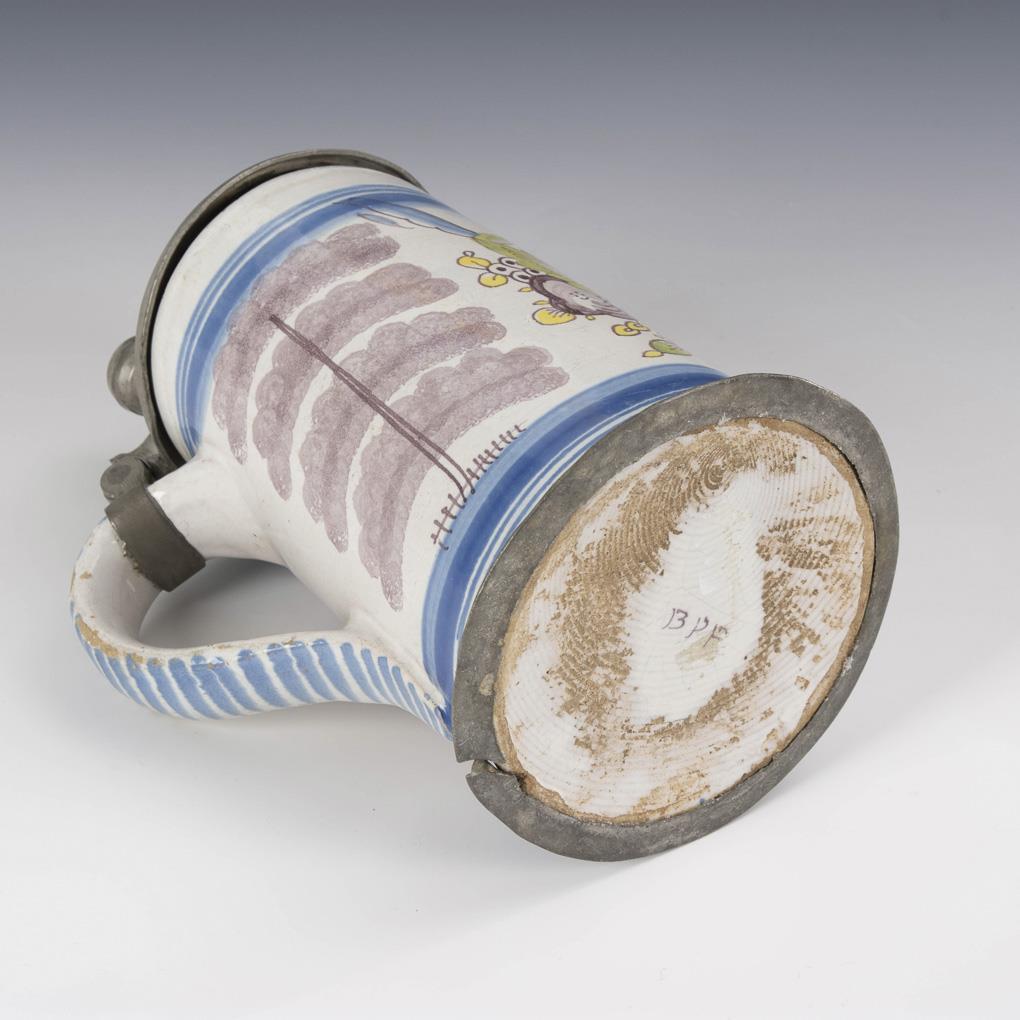 Zylinderkrug mit Bandhenkel. Schauseitig ein farbiges Blumenbukett zwischen mangangeschwämmelten Etagenbäumen. Profilierter Zinndeckel mit Kugeldrücker, graviert "MMGM", Zinnstandring. Partiell leicht bestoßen, Glasurbereibungen, Zinnring defekt.