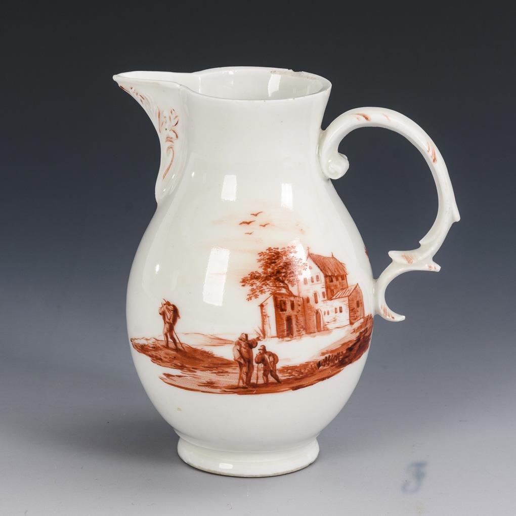 Birnkännchen mit Rocaillehenkel. Beidseitig eine Flusslandschaft mit Architektur und Personenstaffage. Bestoßung am Rand, am Henkelansatz und an der Schneppe, kleiner Brandriss an der Schneppe.